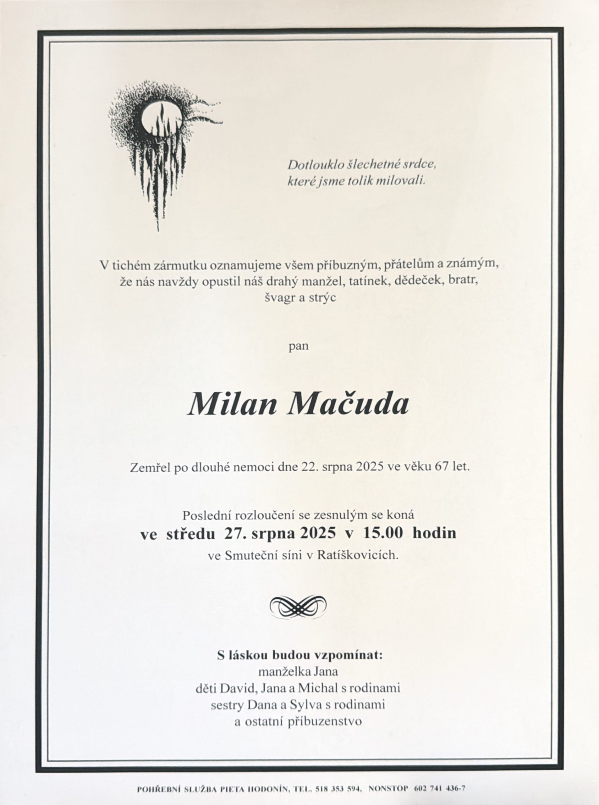 S hlubokým zármutkem oznamujeme, že nás navždy opustil náš blízký přítel a dlouholetý člen našeho klubu, pan Milan Mačuda.